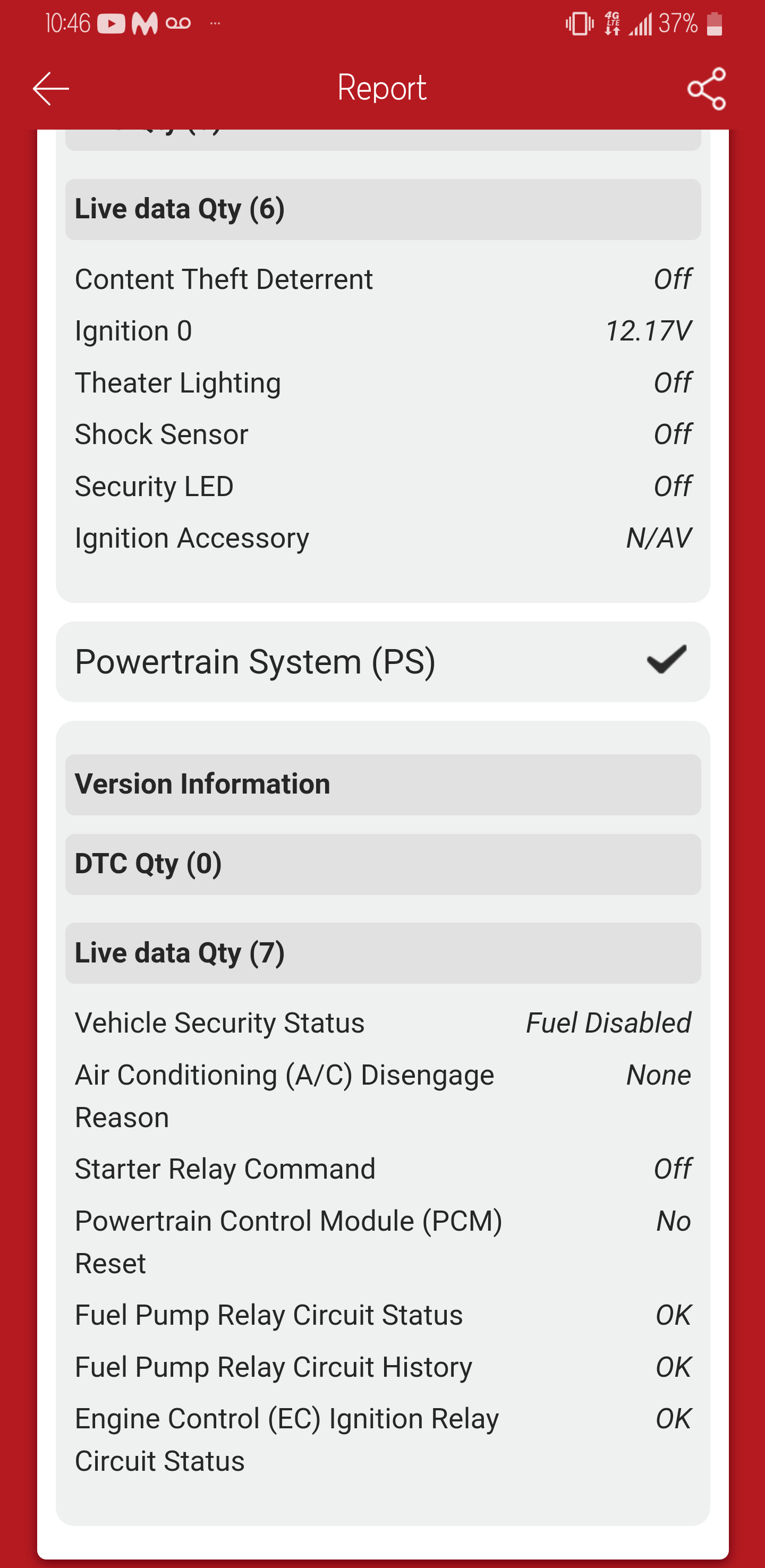 Nope, the security light does not flash when I try to crank it. however, I posted a picture of the last time I did a scan on it. It said security system, fuel disabled. Hold up I'll attach it. This is after changing the PCM. The same issue. Apparently, it isn't the PCM. I did the key relearn properly and the security light doesn't come on when I cycle the key. But it still doesn't power the fuel pump, this picture kind of explains it...