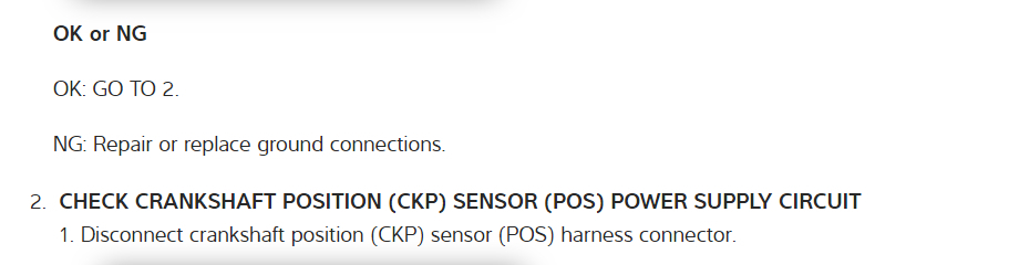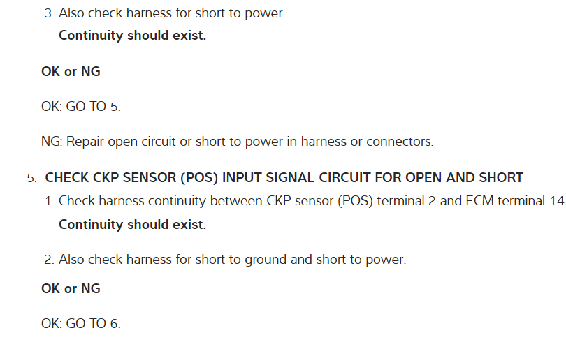 Why didn't you say you had a Direct Trouble Code (DTC) number? In the diagrams down below I have included the factory diagnostic troubleshooting guide for DTC P0335, a wiring diagram for the Crankshaft Position Sensor (CKP), as well as guides for finding shorts to power,intermittent faults, and inspecting and cleaning ground connections. You will need to use a digital multi-meter (DMM) to do these tests. Here is a link for you to go to that explains how that is done: