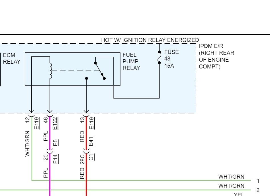Fuse 48 provides power all the time to the relay, but the relay remains open until it is actuated. For that to happen, when you turn the key to run or start, power from the ignition switch goes to the relay via the white wire with a green tracer. At that point, the PCM needs to provide a ground path via the purple wire to complete the primary side of the relay.
