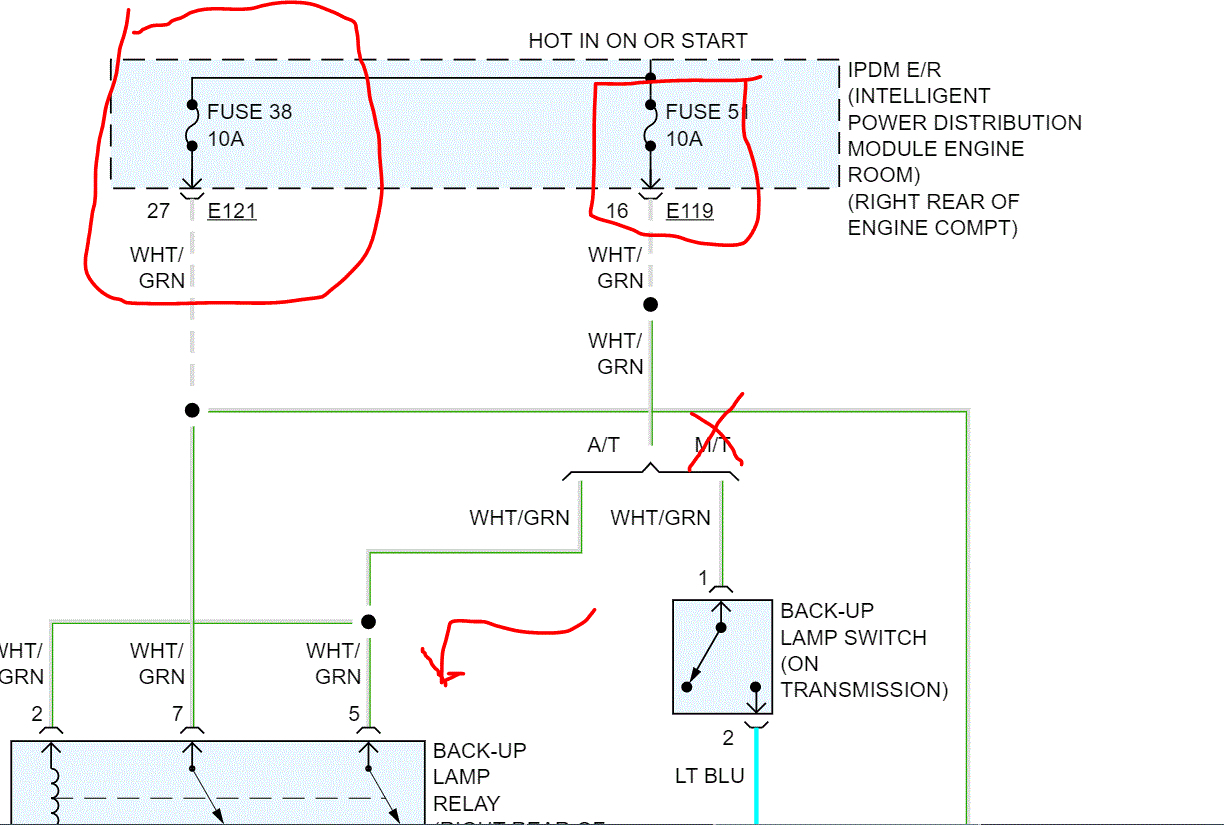 First, does the gear indicator show R when you place it in reverse? Next, there are two fuses I need you to check. In addition to checking the fuse, make sure power goes in and out. See Pic 1