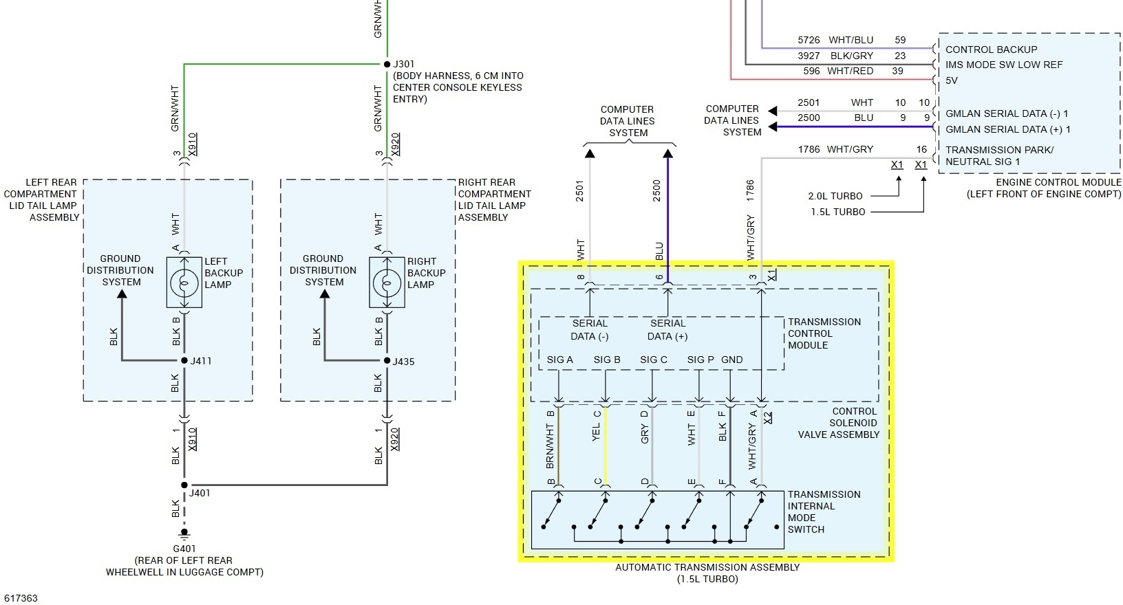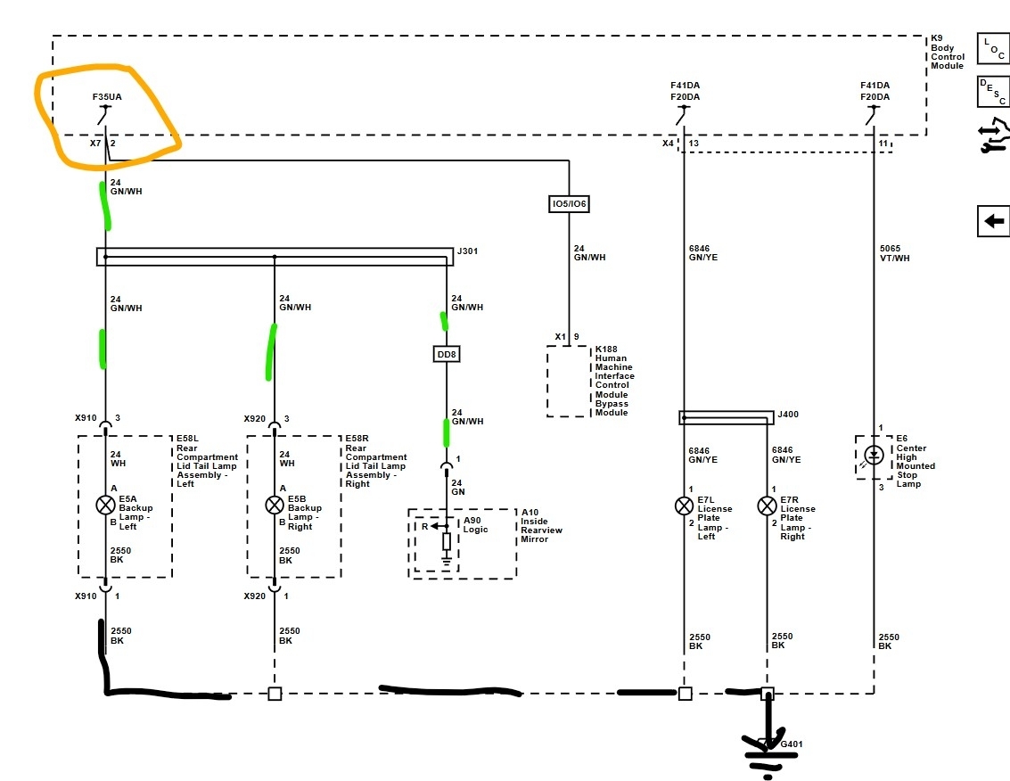 There is no fuse, the power for the reverse lights comes from the body control module. The range sensor in the transmission tells the PCM what gear it is in and that tells the BCM which activates the reverse lamps. There also is no individual switch for the lights it is part of the internal switch that also shifts the transmission. The simple test to determine where the fault lies is simple. When you shift the transmission into reverse does the shift indicator show it and does the car move in reverse? If yes it isn't the internal switch as it converts the switch positions into a digital signal that tells the BCM through the network. The first diagram is the OE for the lights. The other three are all of the circuits for all three engines, yours is in the third image at the bottom. Now it is possible that the lights ground wire has failed, do the license plate lamps work? They share a ground. If they are on the ground likely isn't the problem. Especially if you had no power in the socket. The only other test would be to go to the BCM and find the Green w/white wire at pin 2 in the X7 connector and see if there was power there when you have the key on and in reverse. Or to apply power to that pin and see if the lights come on. If they do but not through the BCM then you replace the BCM. The BCM is easy to access, go into the passenger footwell and grab the carpet that goes under the dash on the tunnel. Pull it down and the BCM is clipped into place on the tunnel. You unplug the connectors and release the tabs to remove it. To install it you put the new module in DO NOT TRY TO SWAP IN A USED ONE! That can cause more damage because of the global modules they use. You also need a scan tool to set up the new BCM to get it all to work.
