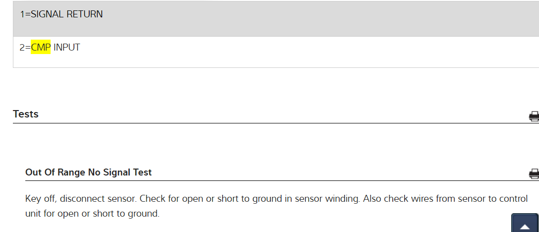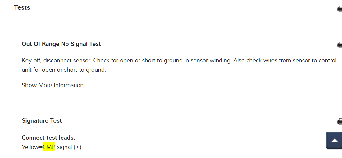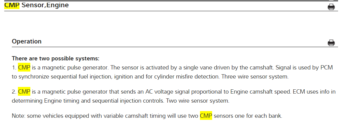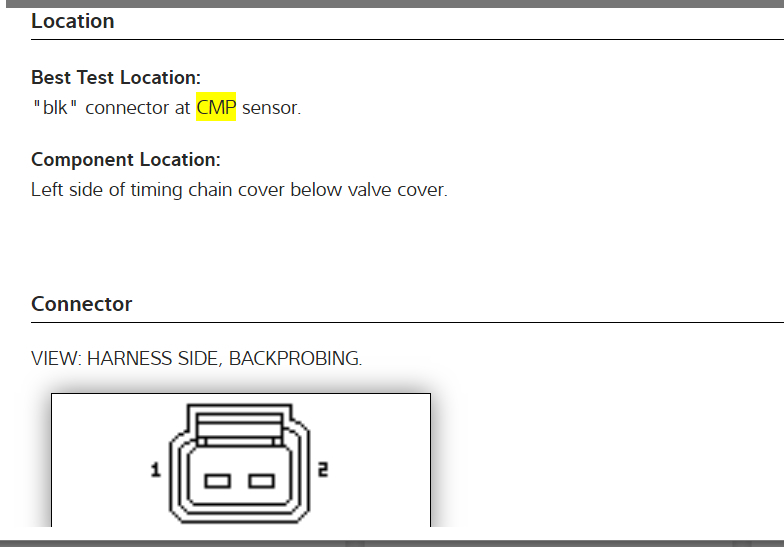 The Camshaft Position Sensor(s)(CMP)(s) on your vehicle send a signal to the Power-train Control Module(PCM) or "computer" and the PCM controls the fuel injectors and the ignition timing from this signal. The first two tests of the diagnostic tests for your vehicle's CMP are pretty straight forward, but the last one will require the use of an oscilloscope to complete but I included it just in case. Usually if a CMP or CKP is suspected of being bad, it is just replaced. They can be picked up at any auto parts store for around $20.00. Please go through the tests included in the diagrams down below and get back to us with what you find out.