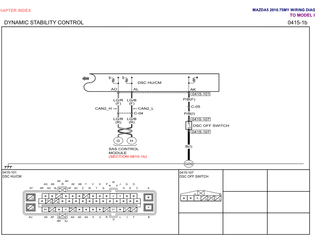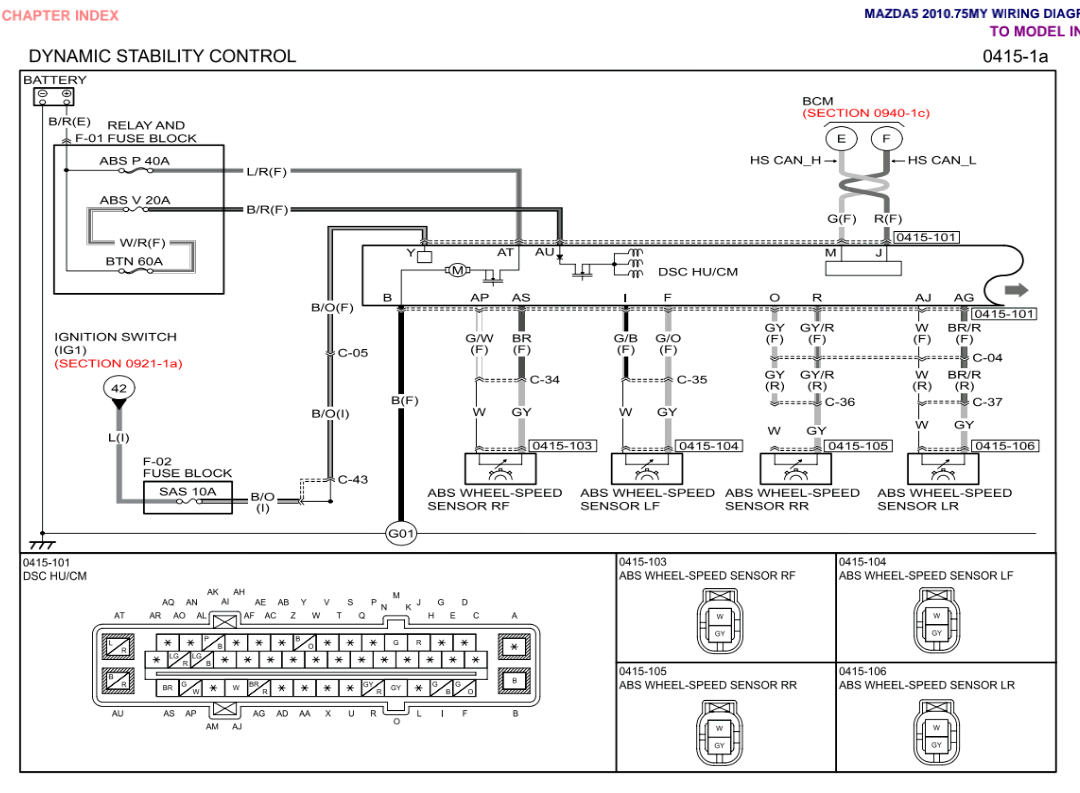 Do you know if your car has Dynamic Stability Control (DSC)? Some Mazda 5's do not have it, some do. There are 2 different wiring diagrams depending on that.The first 2 diagrams are without DSC, and 2nd 2 are with DSC.