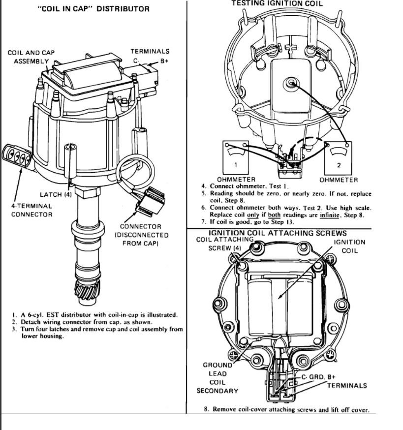 Disconnect the ignition switch battery feed wire and tachometer lead if equipped from distributor cap. Also, release the coil connectors from the cap (do not use a screwdriver or tool to release the locking tabs).