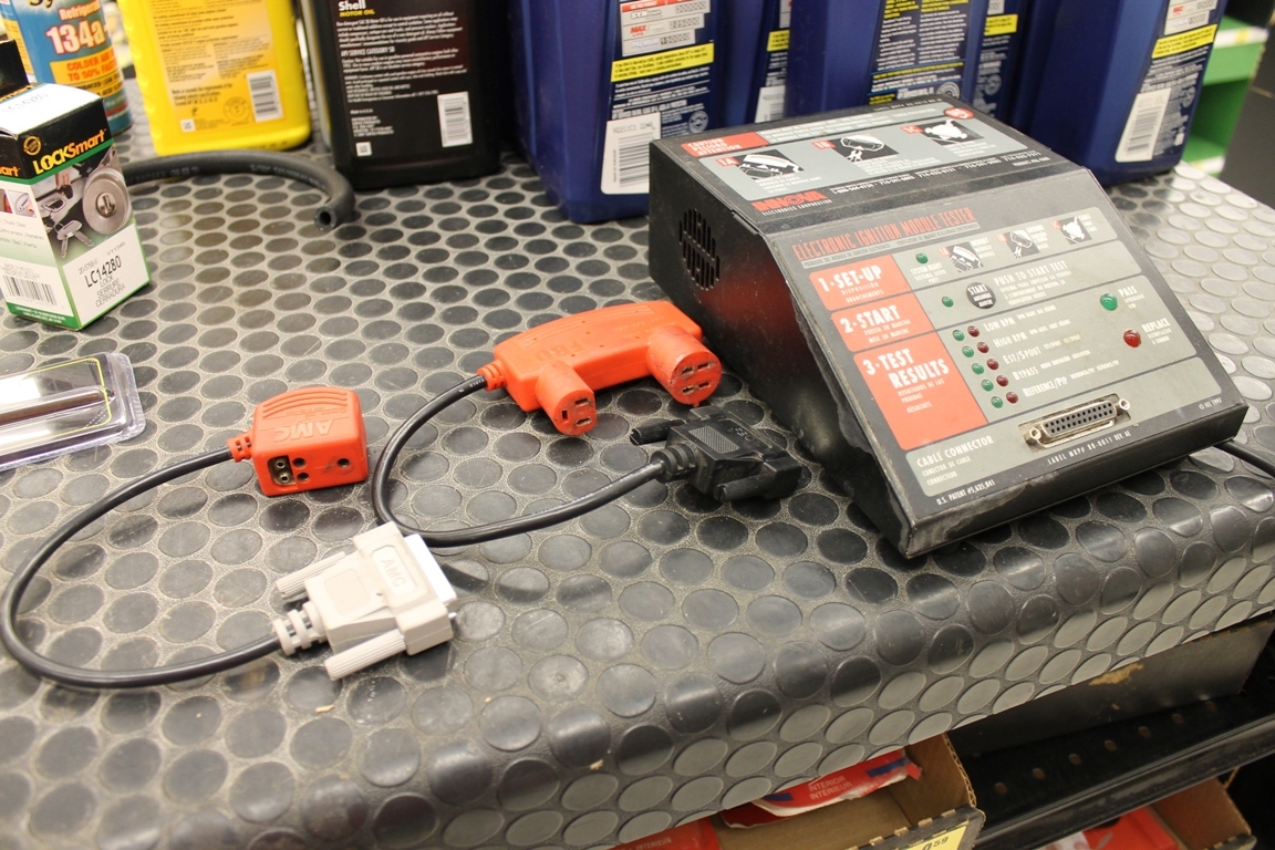 pic 2) you can have your ign module tested at a parts store, this happens to be advance auto parts' machine. i laid out 2 pigtails for this pic, the one next to the machine is to test a motorcraft module, the one to the left is for prestolite. run the test at least 5 time in a row, to insure the module is good, do the same for a new one, should it be needed, before you leave the store.