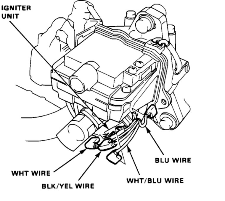 Disconnect the WHT wire, BLK/YEL wire, WHT/BLU wire, and the BLU wire from the igniter unit.