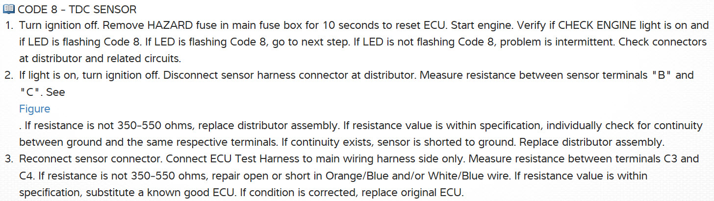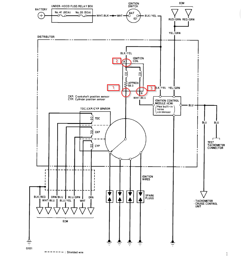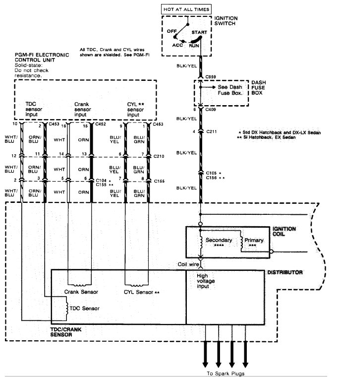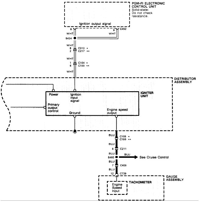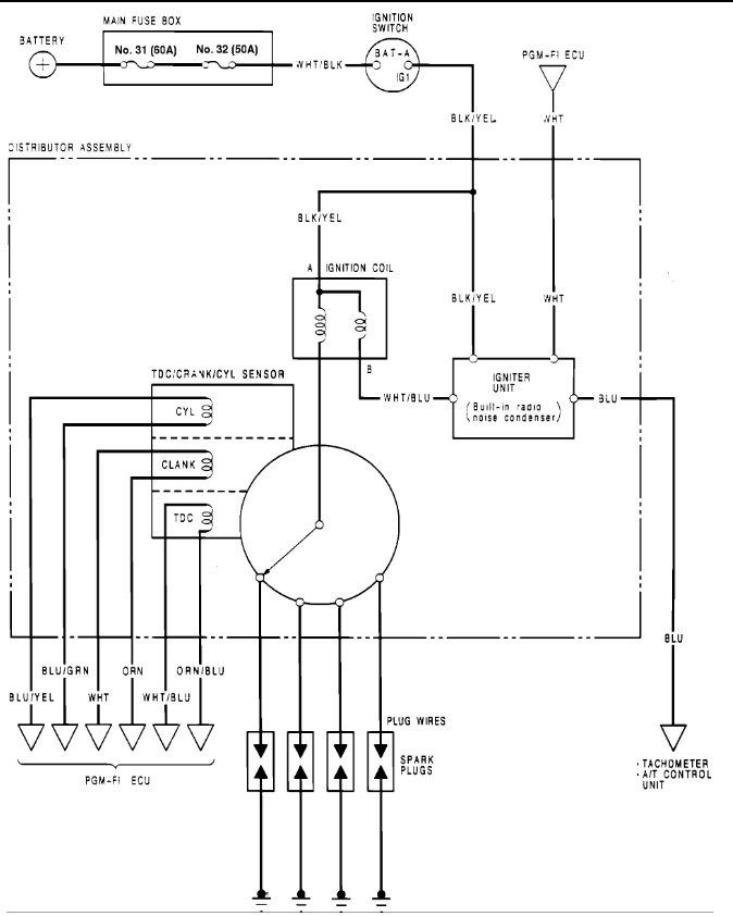 An open in the WHT wire between the igniter unit and the PGM-FI ECU. -Poor ground at thermostat housing (G101 or G151). Refer to Cooling System / Cooling Fan Motor / Diagrams . See: Engine, Cooling and Exhaust\Cooling System\Radiator Cooling Fan Motor\Diagrams\Electrical