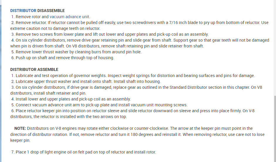 Now, because of the model year, there is nothing in the manuals. So, I have to try and explain what to do. However, before doing anything, turn the key to the run position and confirm there is power on the positive side of the coil. If there is no power, a new distributor won't help. At that point, we will need to go back to the ballast resister and do some checking and after that, the ignition switch.