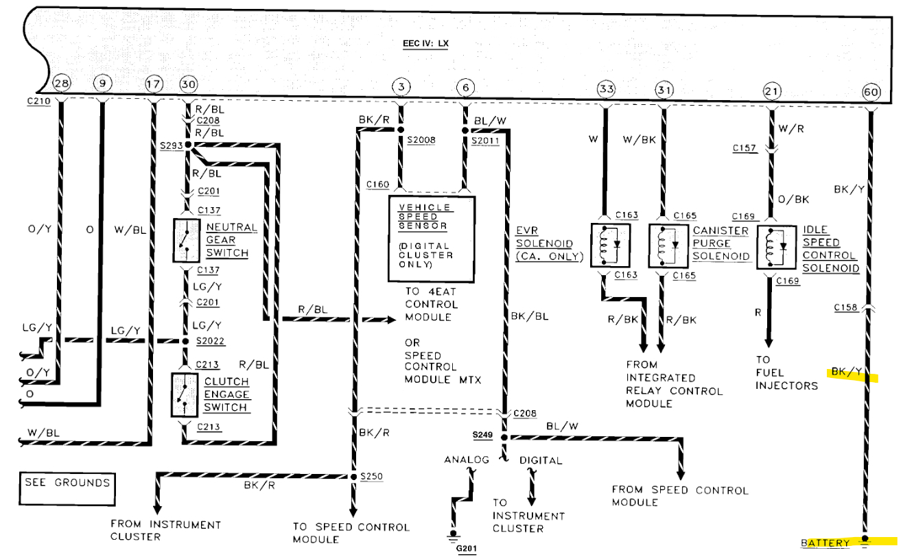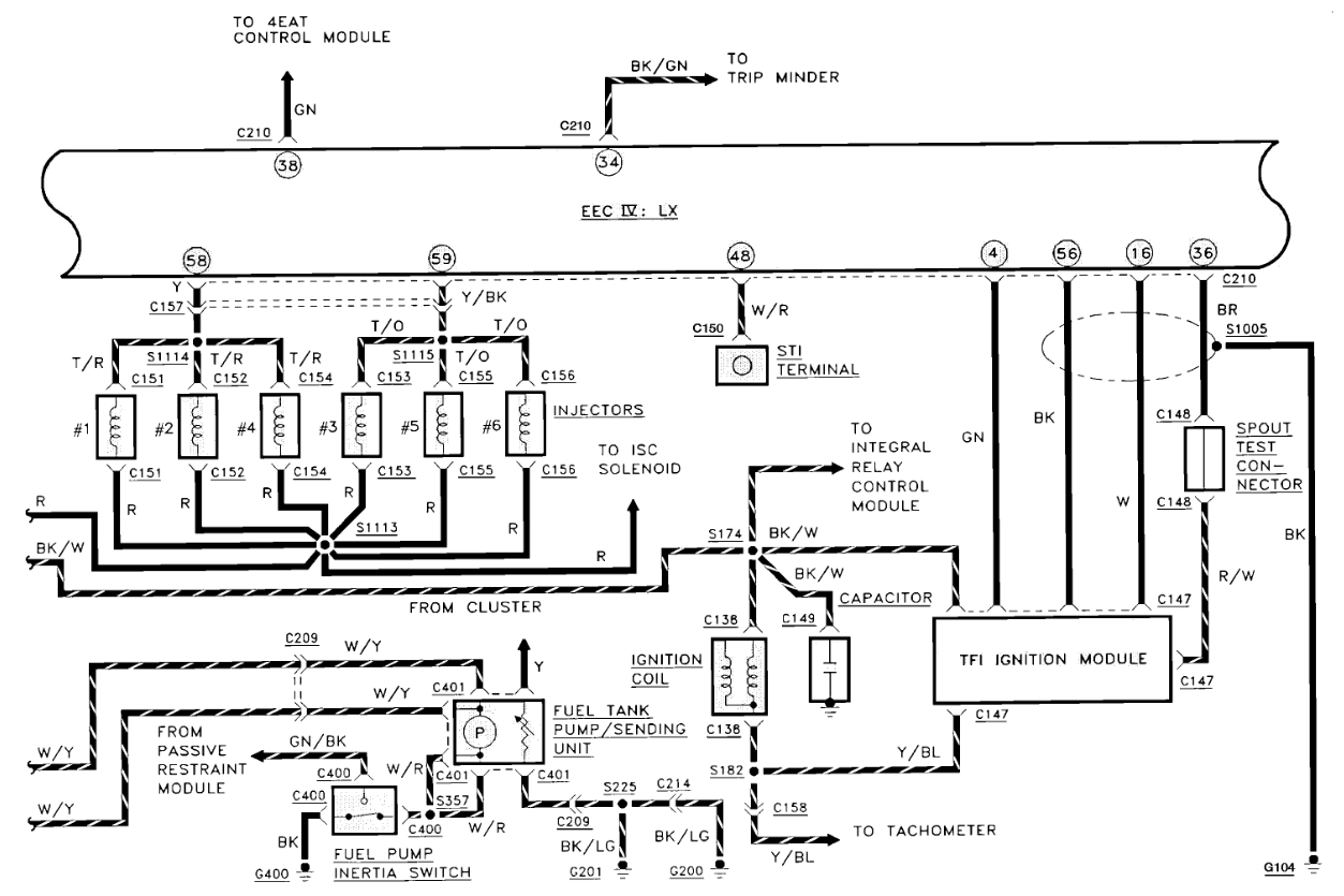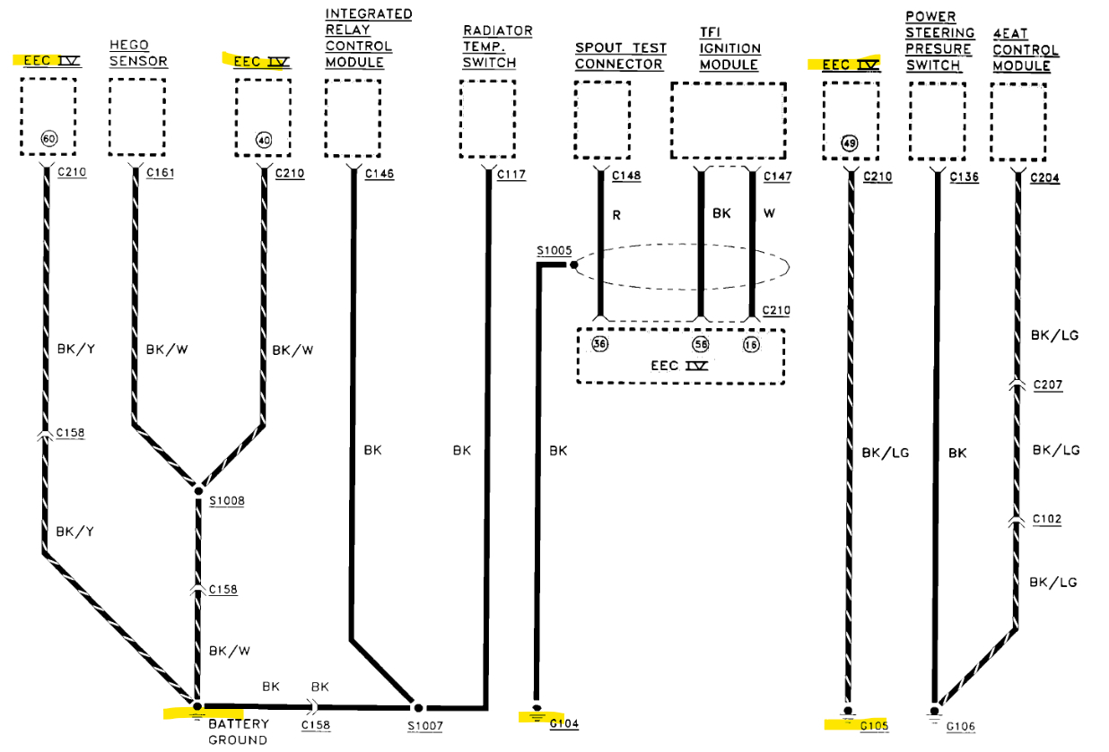 These are some of the Grounds for the PCM, you can see that there is a shielded ground wire that goes around the some of the TFI Ignition module wires, this is just to shield those wires from any interference from the ignition coil and wires, Some people get confused about it, thinking that's its actually spliced into those wires, but it's not. It just helps to pull any interference to ground. Check the power to the PCM as well. I'll keep going through wiring diagrams to find some decent ones.