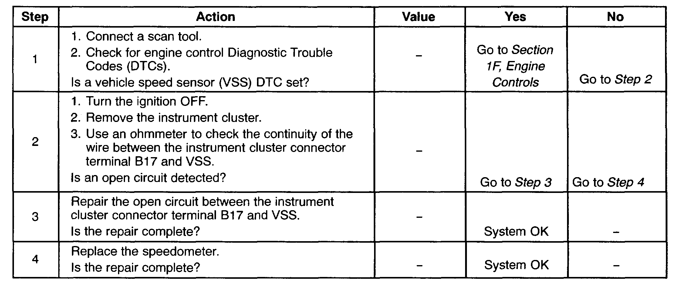 You must have an open circuit between the vehicle speed sensor and the cluster. I attached a diagnostic flow chart that explains which pins to check on the cluster. You will need to check for continuity so you will need a digital multi-meter. Take a look through the chart and let me know if it helps or if you have other questions.