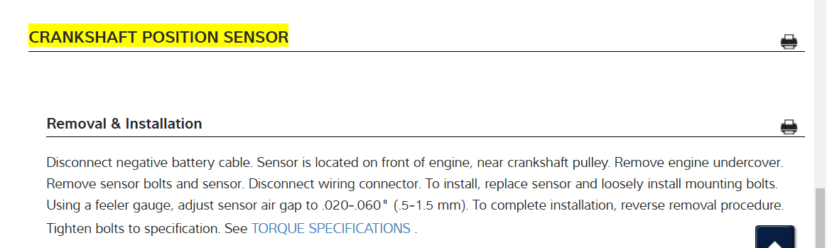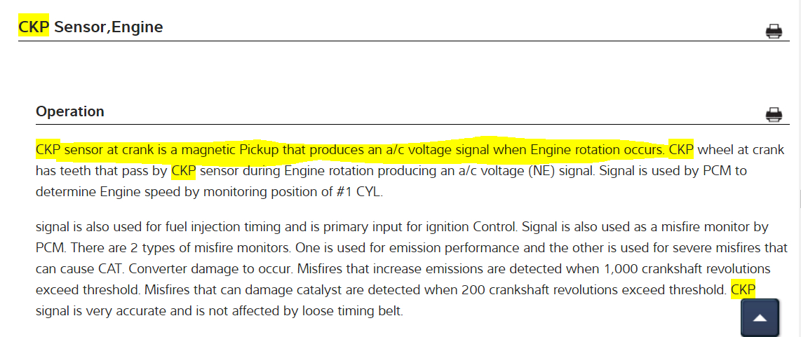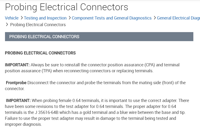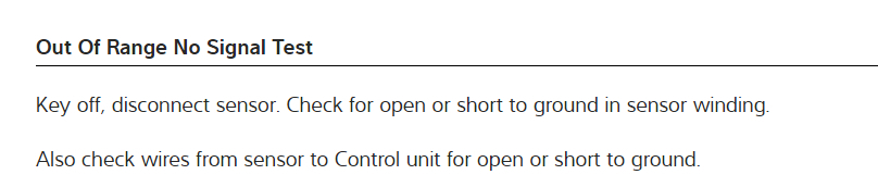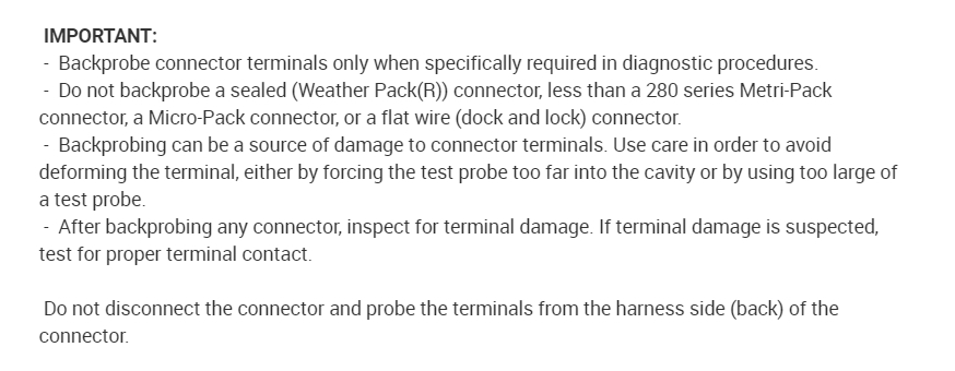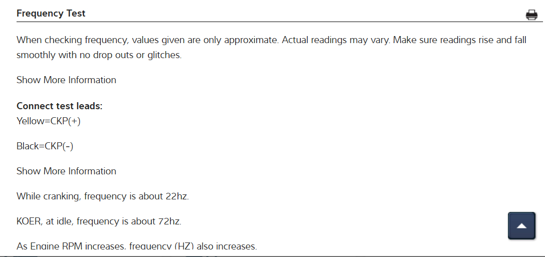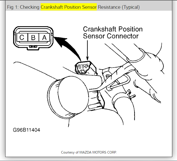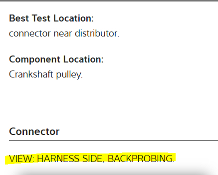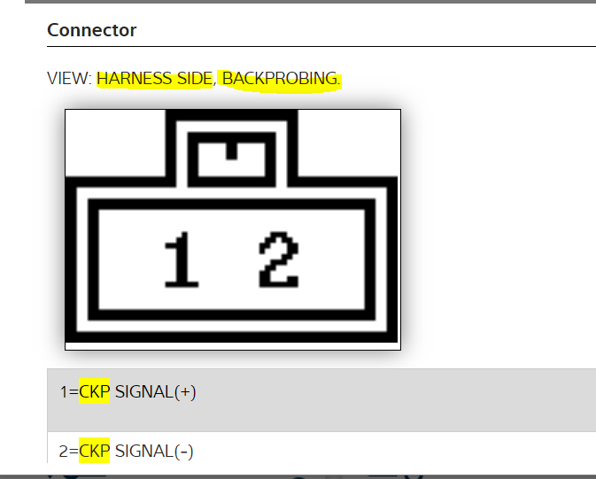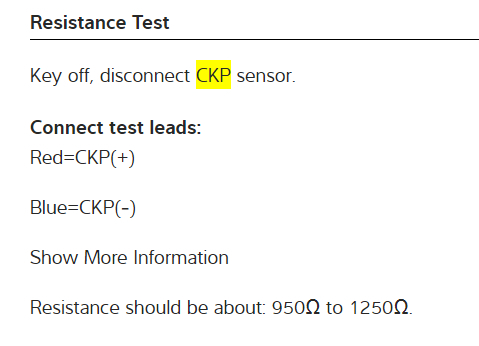 Okay, the resistance is in specs, so the sensor itself looks good. Let's look at the delivery system. In the diagrams down below I have include the wiring diagrams of the CKP circuit for your vehicle, as well as instructions for how to inspect electrical connectors and how to test for unwanted resistance in an electrical circuit using the voltage drop method, which is the preferred method for doing this. Please inspect the two CKP wires and the connectors at the CKP sensor and the ECM connector as well and get back to us with what you are able to find out.