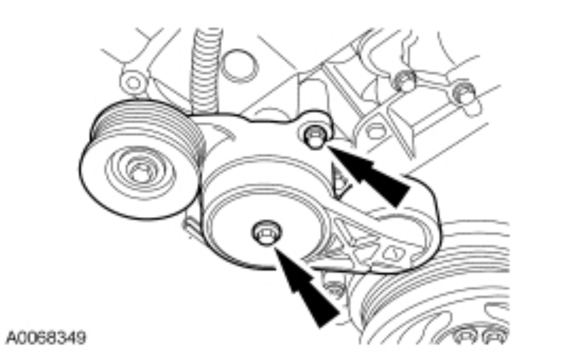 If equipped, remove the 2 bolts and serpentine belt tensioner.