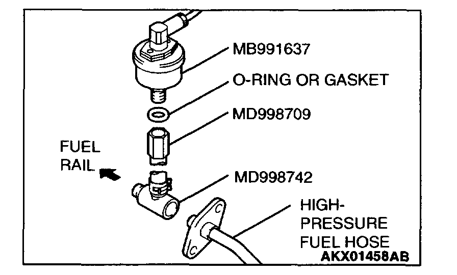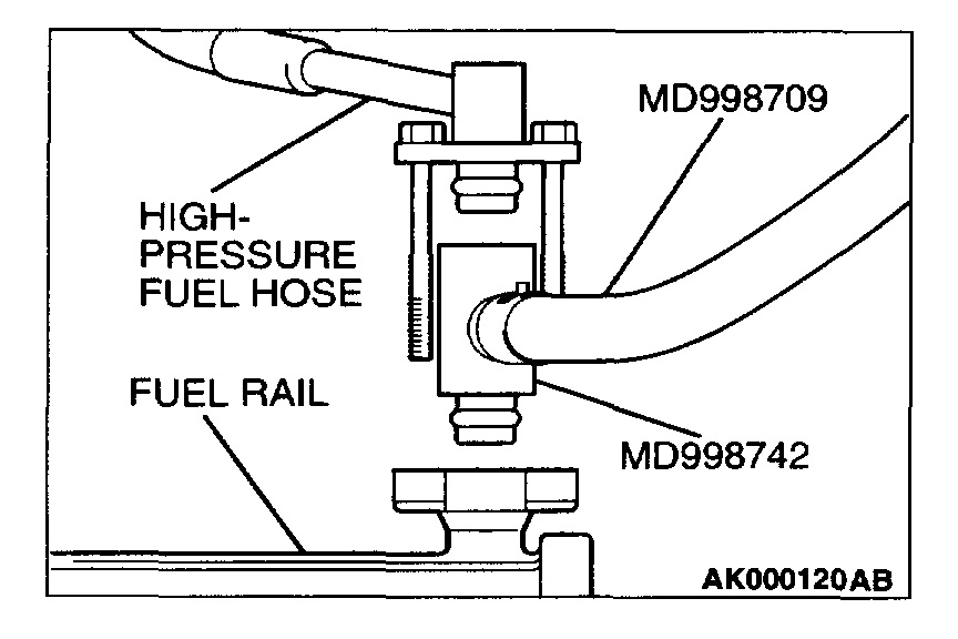 2. Place a suitable O-ring or gasket on assembled special tools MD998709 and MD998742 and install the fuel pressure gauge.