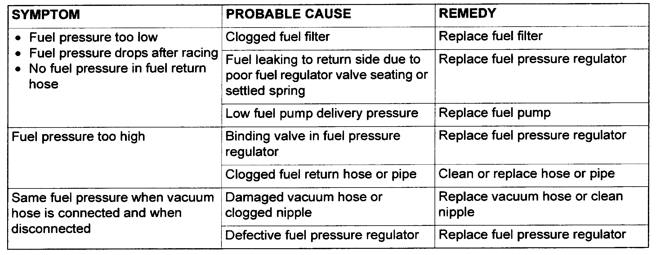 12. If any of fuel pressure measured in steps 10 to 13 is out of specification, troubleshoot and repair according to the table.