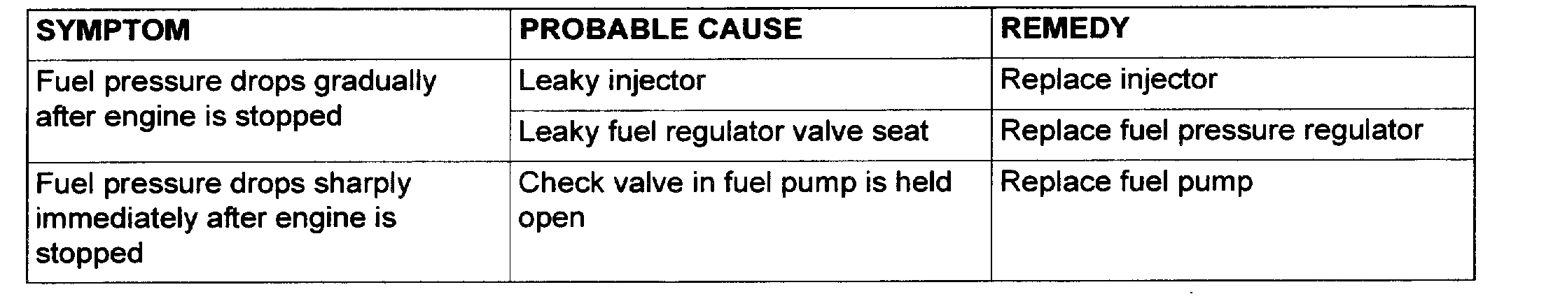 13. Stop the engine and observe fuel pressure gauge reading. It is normal if the reading does not drop within two minutes. If it does, observe the rate of drop and troubleshoot and repair according to the table. Start, then stop the engine.