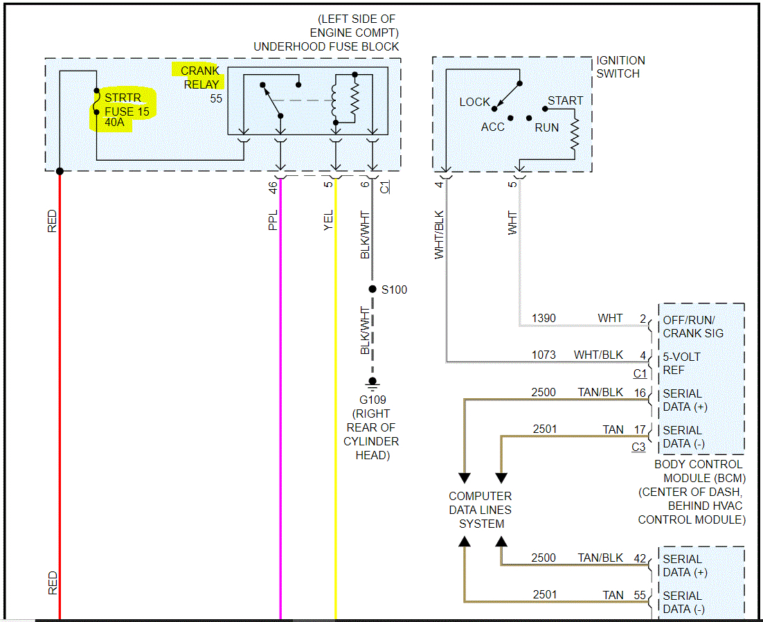 If you look at the attached pics 1 and 2, I attached the wiring schematic related to the starting system. Pic 3 shows the fuse and relay in the fuse box under the hood.