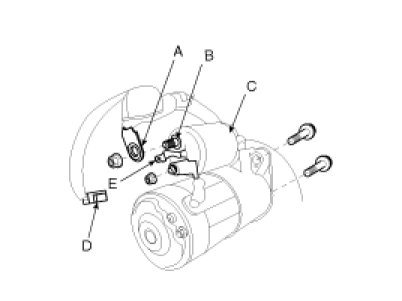 2. Disconnect the starter cable (A) from the B terminal (B) on the solenoid (C), then disconnect the connector (D) from the S terminal (E).
