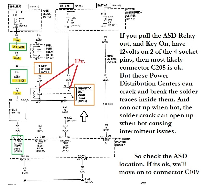 Okay, if you have battery voltage at Fuse 6 and not at A2, we need to figure out why, there's 2 connectors in series to the PCM, connector C205 pin 31, then a Splice S110 that is inside the Power Distribution Center (PDC) which branches off to the ASD Relay, then connector C109 pin 1. It's a light green/black wire the entire way. I will find these connectors.