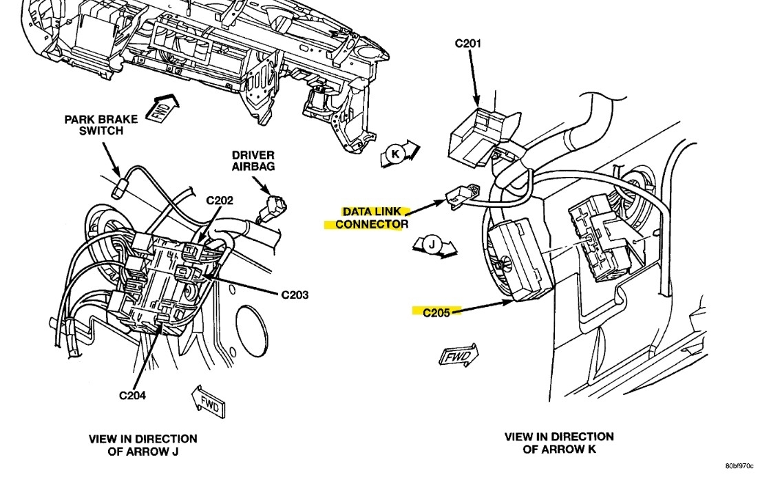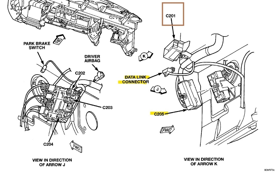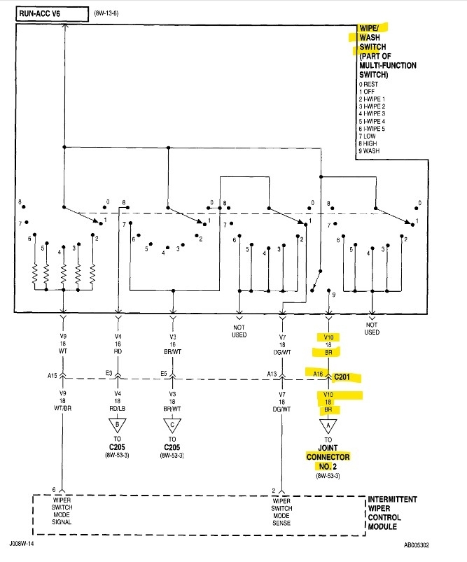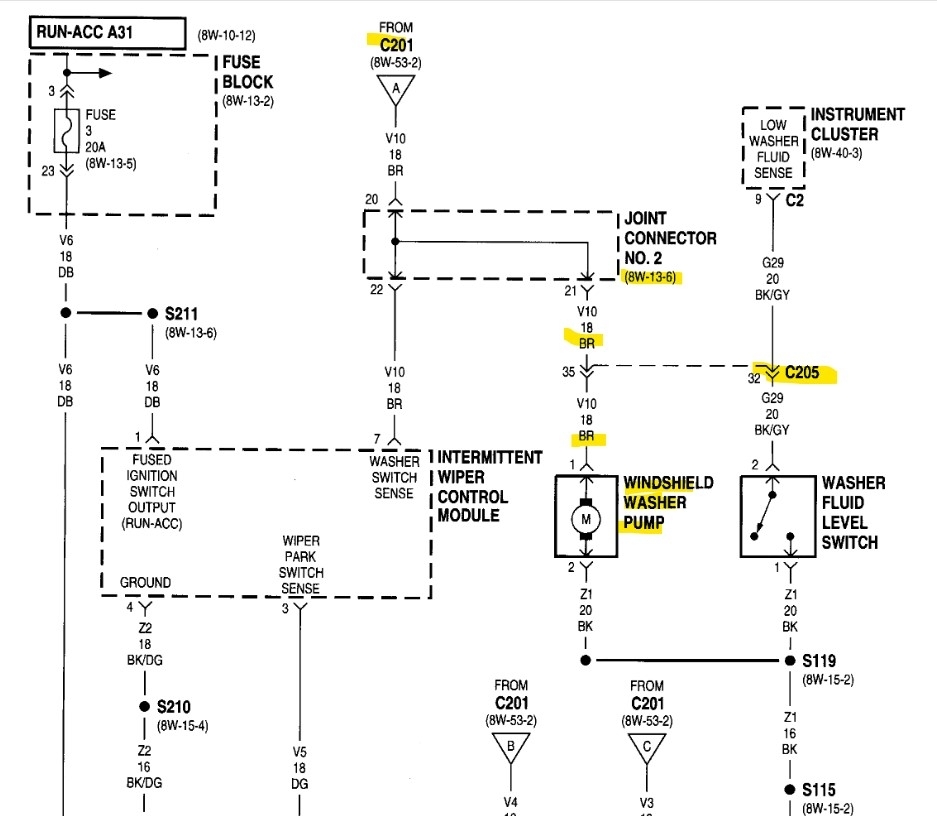 So, in the OEM diagram the washer pump's power feed comes from connector C205 next, which is just below the data link connector, it's still a brown wire there, pin 35. Then goes to that Joint Connector No. 2 which is probably on the steering column going towards the switch.
