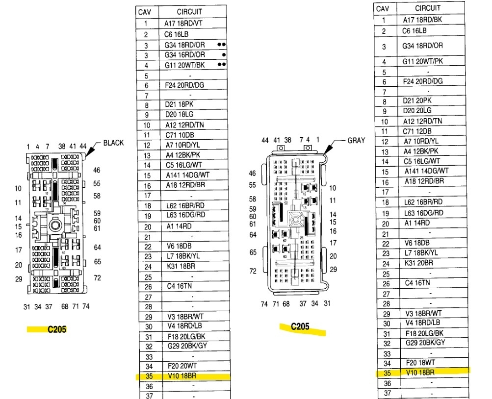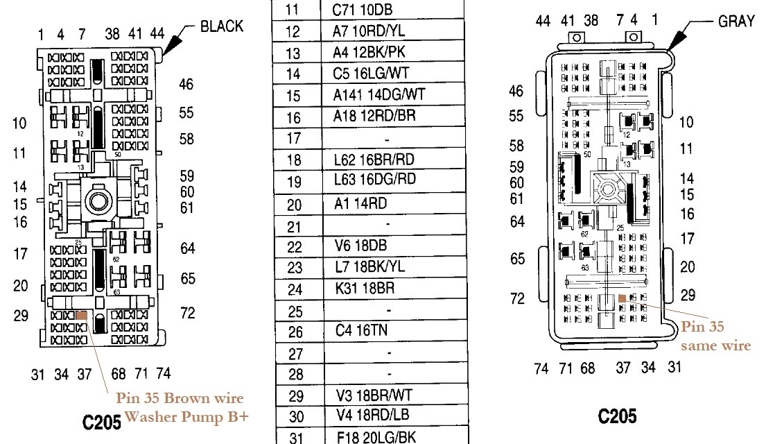 Actually, after C205 the brown wire runs to C201, its pin A16 circuit V10 still a brown wire. Thats the washer pump feed still. And C201 ends at the Multifunction Switch, so it can be traced all the way back to there.