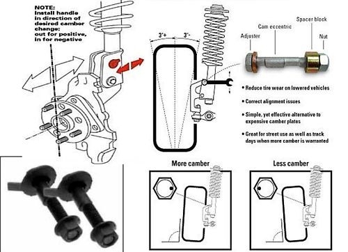 Thank you for the fast response. I found them on eBay. 4 of them bolt's nuts and some kind of what appears to be maybe an adjustment washer. It doesn't come with instructions, but it does show the direction in which you install the bolt. I'm going to try this using the original strut because I don't think it's bad. I think I told you the passenger side is leaning inward by about one inch. So, it needs to come out.its.2.0 degrees, I think. And it should be 0.00 is that correct? I have the alignment print out also. I'm not sure how to adjust the bolt without instructions but it has a shoulder on the bolt. I think the shoulder part rests inside where the original bolt holds the strut to the knuckle. And the high point of that shoulder will pull the tire back into straight up and down position?