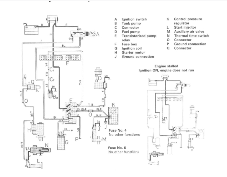 The car listed above is a 240 DL. The car was parked for a few months due to a brake caliper leak. After the winter passed, I decided to get to work on it. Replaced battery as it was old. Car cranks but will not start. Do not hear pumps turn on. Replaced fuel pump relay under dash still no power to pumps. Checked and cleaned fuse #4 on driver side fuse box still no power to pumps. Replaced fuse assembly near coil as it was pretty weathered still no power to pumps. With cranking engine, I forced power to pumps using bridge on #4 and #6 fuses and car starts right up but dies once I remove bridge.