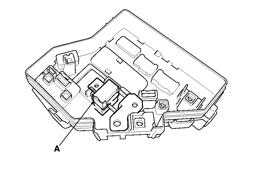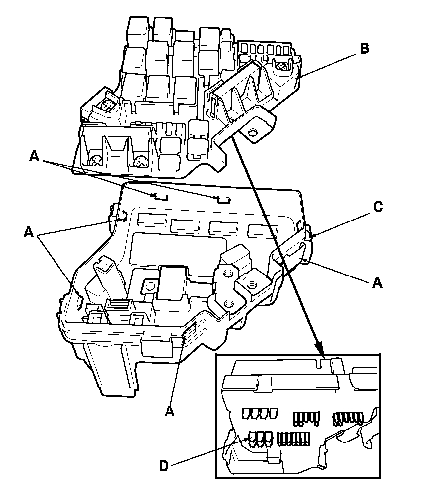 5. Turn the housing over again. Using two flat-tip screwdrivers, release the tabs (A), and pry up the fuse/relay box base (B) from the fuse/relay box housing (C).