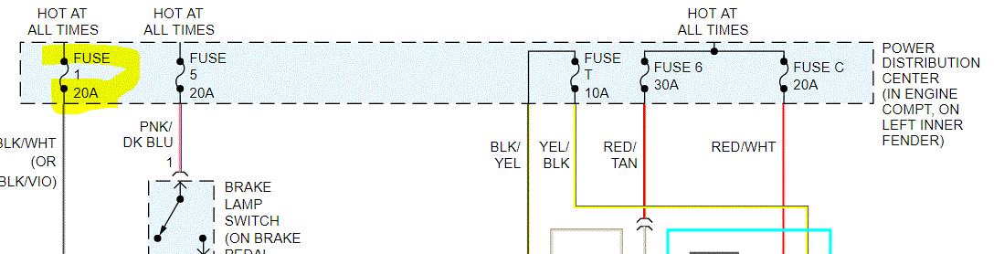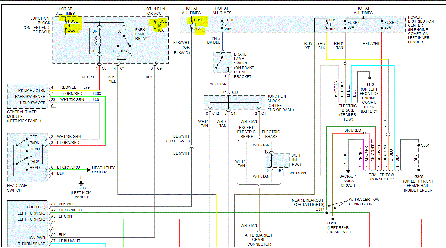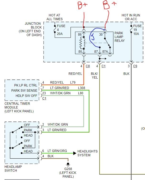 The system works by grounding terminal 85 when you activate the switch. If the above all tests good and you still have no lights then the switch and the output from the central timer module AKA the body control module will need to be tested next. Testing the ground side of the switch is easy, do the headlights come on? If yes then the ground is good as those use the same ground on the switch. To test both the switch and the CTM you need to remove the kick panel under the dash on the drivers side. Behind it you will find the module bolted to the pillar with three connectors on it. You want connector #1 and a red with yellow striped wire on pin #4 and a light green with red stripe wire on pin #7.The wire at pin 4 is the ground signal to the relay you just tested, with the test light connected to battery power that pin should turn the light on when you turn the parking lights on. If it doesn't then move to the wire on pin number 7 and see if it is grounded with the switch on.