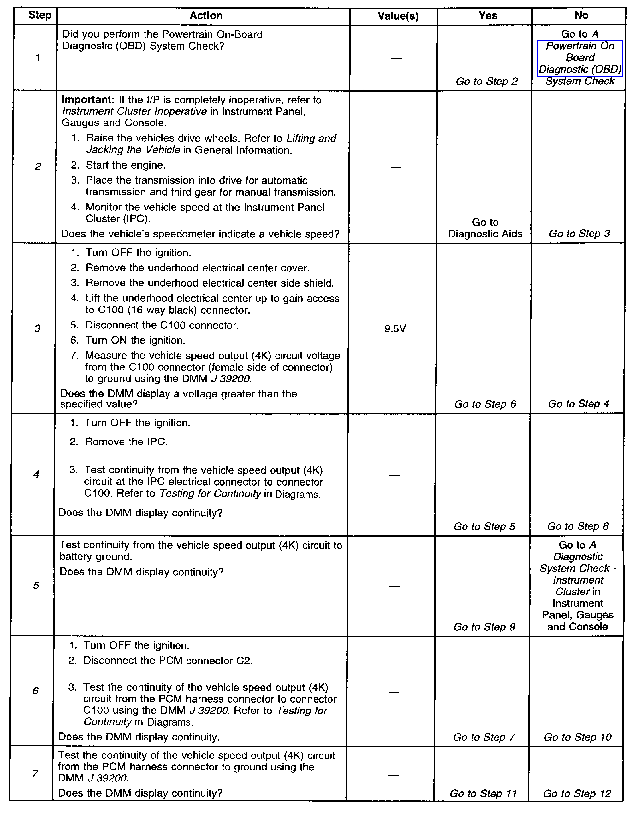 2. Further circuit diagnosis may require I/P removal. Test the circuit from the PCM to the tachometer for being open, shorted to ground or, voltage.