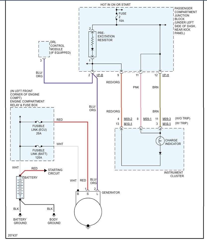 The first step in diagnosing this system is to observe if the "Battery" warning light on the instrument cluster turns on when the ignition switch is turned to "run". If it does not, the blue / orange wire likely has a break. Next, measure the voltage on that wire at the generator's plug, (blue arrow in the third diagram). To be valid, these next two readings must be taken with the connector plugged in. Back-probe alongside the wires to take the readings. Expect to find very close to 2.0 volts. That says the warning light will be on, that wire doesn't have a break in it, that wire's connector terminal where you're measuring is making a good contact, and that wire is not shorted to ground. That is the turn-on circuit that wakes up the voltage regulator to get it started.