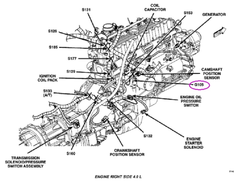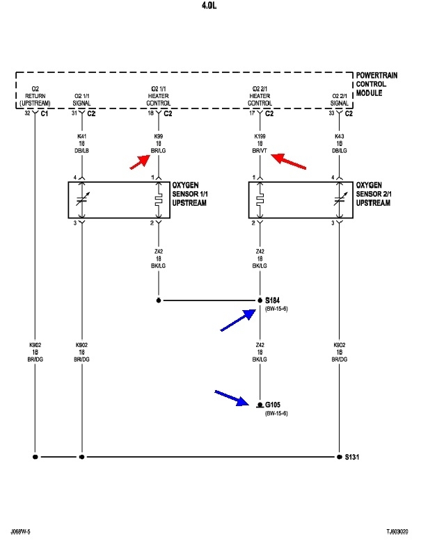 Individually, each of these can be caused by a defective sensor, or the heater circuit wire going to it is cut. When you have all four showing up at the same time, it is just about impossible to have four failed sensors all at once. This is where the items they have in common are the best suspects. These first two diagrams show the two front sensors and the two rear sensors. The four red arrows show the four individual heater circuits. Those are how the computer can monitor the operation of each one. Even the ground wires are separate, until they reach the splices S184 and S185. From there, they go to ground G105. Its location is shown in the third drawing.