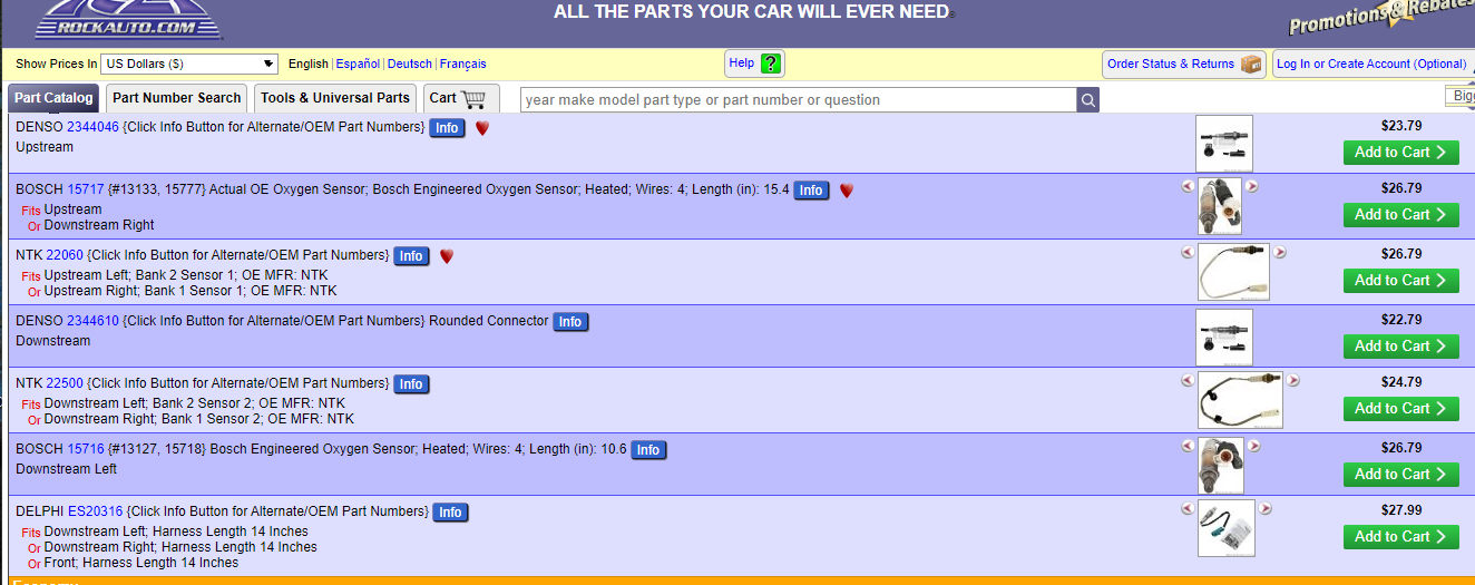 Okay, I attached rock auto site. It has the location of the sensor and the numbers for you.