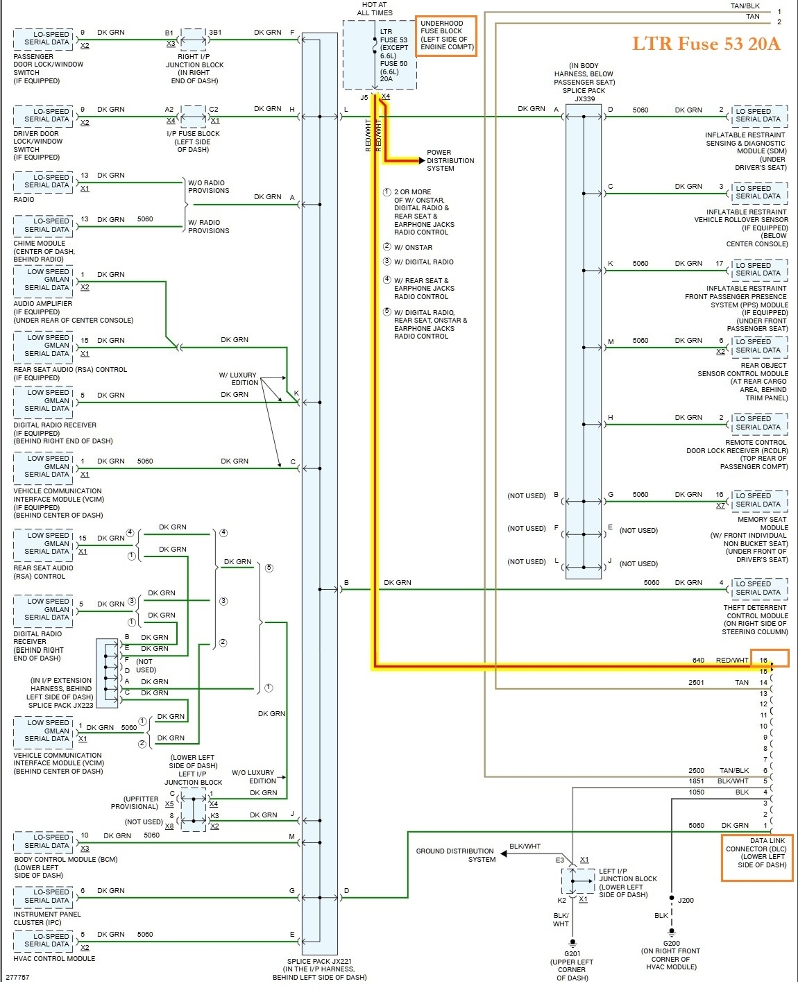 Hello, power for the DLC (pin 16) comes from the LTR Fuse 53 20amp in the under-hood fuse block. I'll post a wiring diagram of the circuit as well.