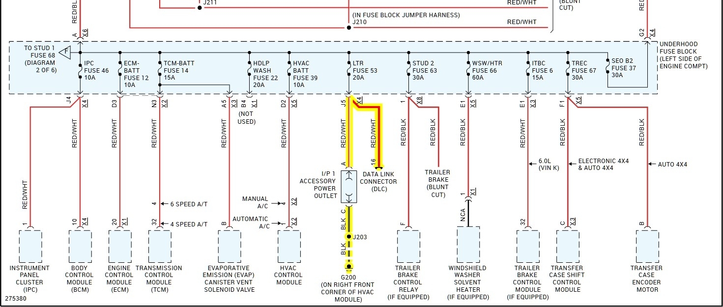 Here is the wiring diagrams for the Data link connector, notice power also goes to the I/P Accessory power outlet, so I would make sure nothing fell into the power outlet and shorted it out, blowing the fuse.