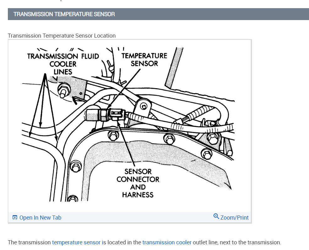 The transmission temperature sensor is located in the transmission cooler outlet line, next to the transmission.