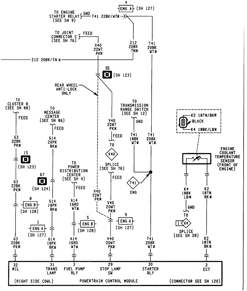 If you haven't found a grounded wire by now, start by measuring the voltage on the tan / black wire at the coolant temperature sensor. The ignition switch must be in "run". If you find close to 0.0 volts, as the fault code has indicated, unplug the connector and recheck on that wire. I'm going to say it will stay at 0.0 volts, but in the very unlikely event I'm wrong, we'll have to look at the sensor for damage causing both wires to touch. I'm suspecting that tan / black wire is grounded long before it gets to the sensor's plug, so unplugging it isn't going to change anything. If you do find 0.0 volts, you should be able to monitor that voltage while you wiggle and move wire harnesses around. If you do something to momentarily remove the short, the voltage on that wire will jump up to 5.0 volts if the connector is unplugged, or to something between 0.5 and 4.5 volts if the connector is plugged in. A typical signal voltage is in the area of 2.5 volts, give or take a volt, at around 60 degrees.