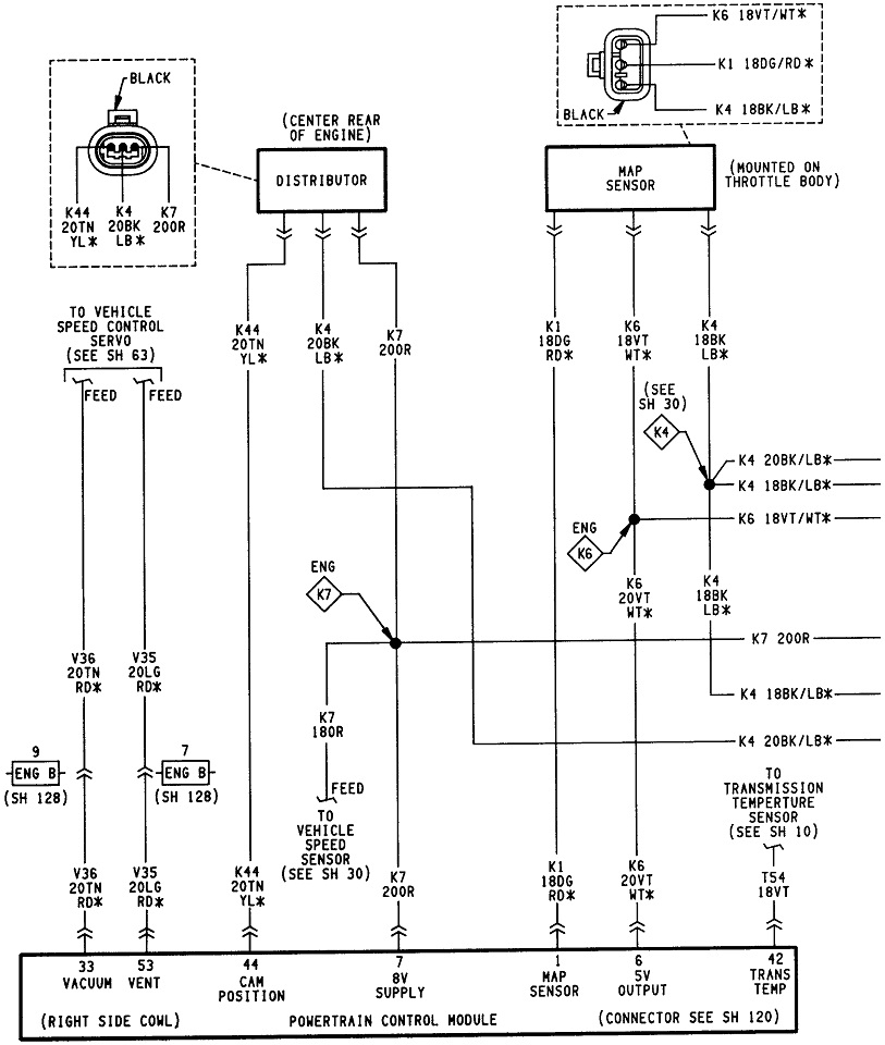 To get fault code 22, the tan / black wire is likely grounded someplace. First look at the wiring harness running to the engine to see if it has fallen down and is rubbing on the sharp edge of a metal bracket. Another place to look is if that harness runs on top of the inner fender or along the firewall and slides back and forth as the engine rocks. If you don't find anything, we're going to have to do a continuity or voltage test. If I remember correctly, that voltage should jump back up as soon as a short is removed.