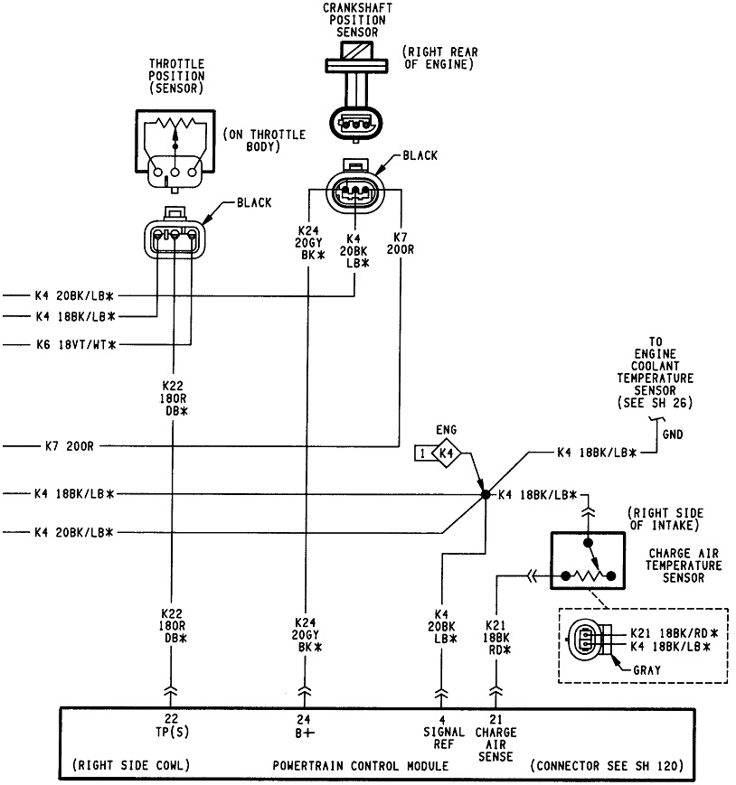 Both sensor circuits are fed with a carefully regulated 5.0-volt supply from the Engine Computer, but they leave on different terminals. The CTS simply draws the voltage down on that line to form the signal voltage. Its sensing circuitry is inside the computer. The TPS 5.0 volts leaves the computer from terminal # 6, but note that line feeds multiple sensors. It feeds the MAP sensor and the crankshaft position sensor. If the engine runs, the crankshaft position sensor has to be working, so we know that 5.0-volt supply has to be okay.