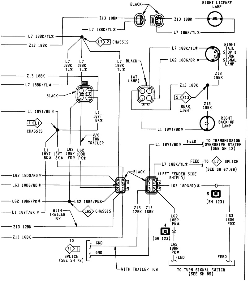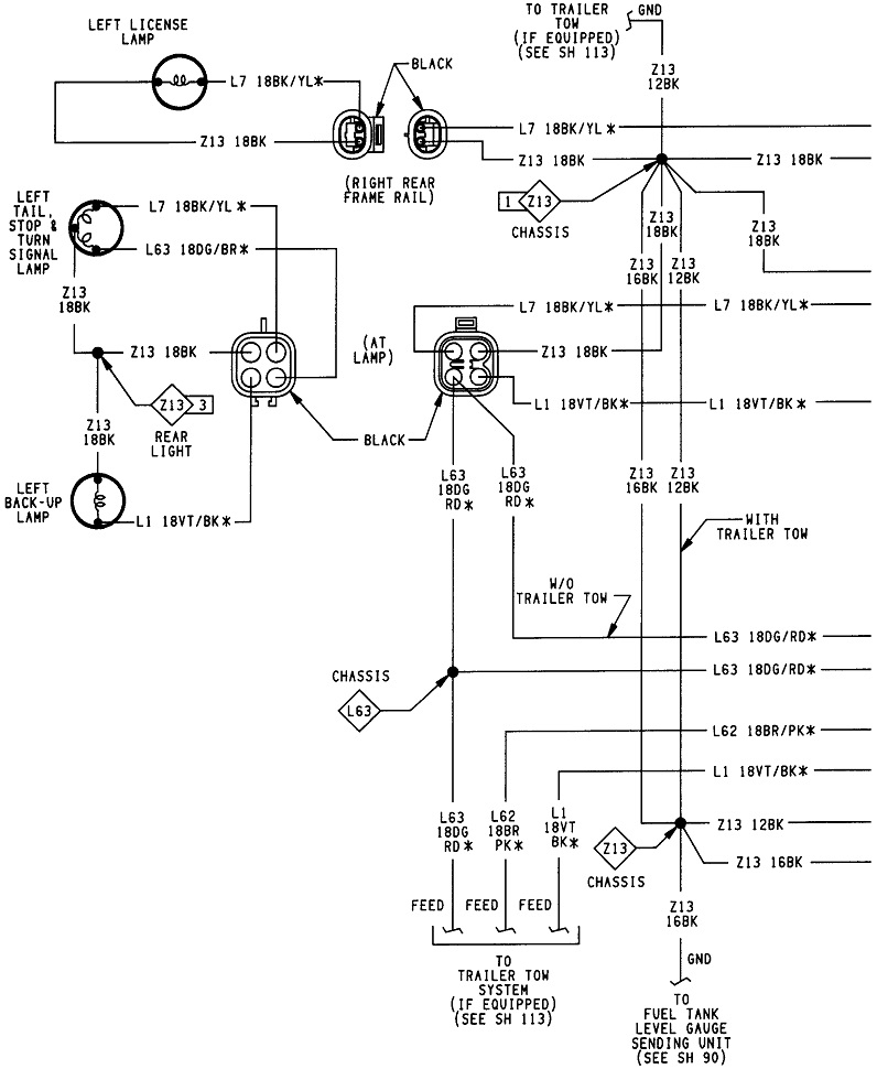 I posted the two wiring diagrams for the rear lighting so you can look for the wire colors. Black wires are normally ground wires, although Chrysler often uses a black wire with a stripe, or "tracer", for ground wires. Good example is black / blue for sensor ground wires. Here I see the 12-volt feed for the taillights is a black / yellow. Wouldn't have been my first guess. While it is possible, other than those black ground wires, you will almost always find original wires have a tracer. For example, look near the lower right of the second diagram. A wire is listed as "L63 18DG/RD". That's circuit "L" for "lighting", "63" simply to differentiate it from other circuits, 18 gauge, dark green with a red tracer. The "*" just means there's a tracer. "A" circuits come from the battery's positive post or from a fuse that comes from that post. "Z" circuits are grounds. Letter designations, such as the "L" here, don't always have to match a word representing the circuit.