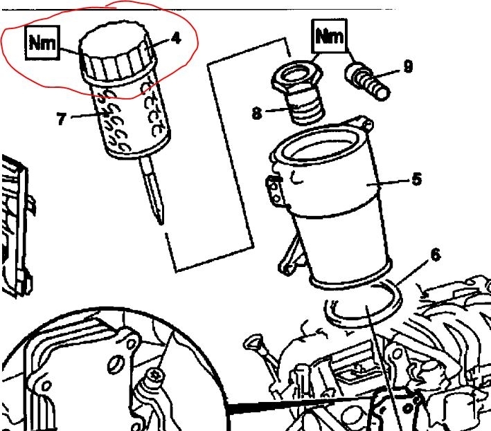For the filter, wipe off the plastic housing, then remove the filter housing cover. Have a rag or tray handy so that when you pull the cover up the filter doesn't drip on everything. Remove the old filter, wipe the surface of the cap and housing off, replace the O-rings and apply a small amount of oil to the seals, then install the filter and tighten the cap back in place. The cap is tightened to 25 Nm or about 18 ft lb. Don't try to tighten it very hard as they are easy to crack. Now refill the oil. Start the engine and run it for about 30 seconds, and check the oil level.