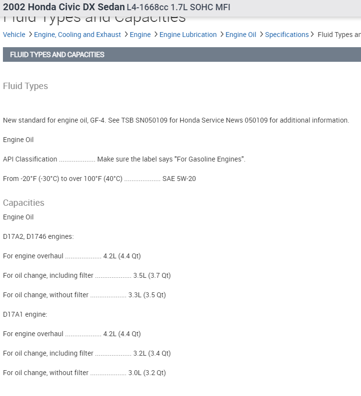 The recommended oil is 5W-20. You will need 3.7 quarts of oil.