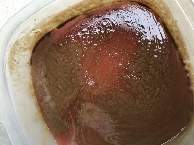 If you notice in the video the color of the fluid he is using. It is a greenish color and feels very much like mineral oil. It is not traditional pink/red transmission fluid. If mixed with coolant it can darken in color.