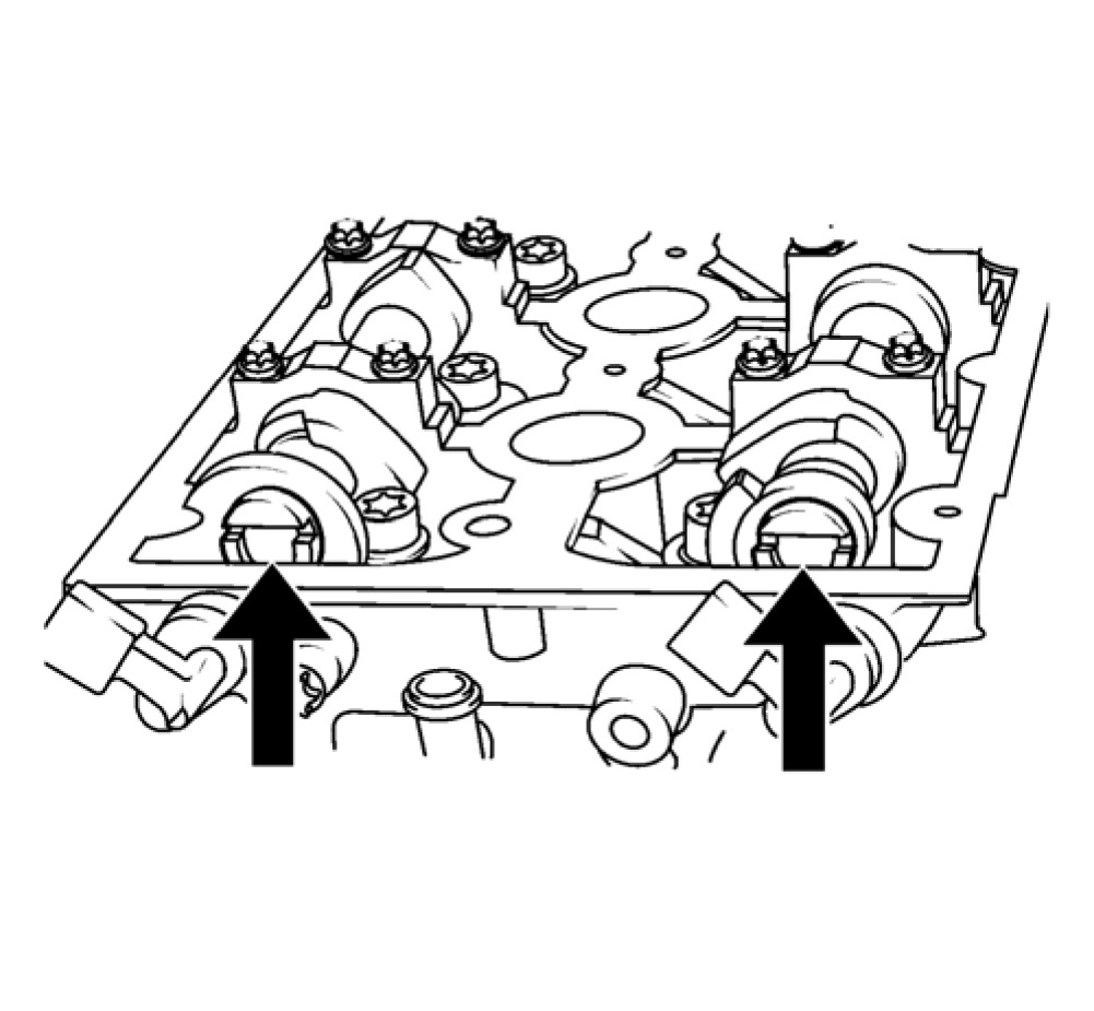 ^ Install EN-6340 locking tool - right (2) into the camshaft adjusters as shown.