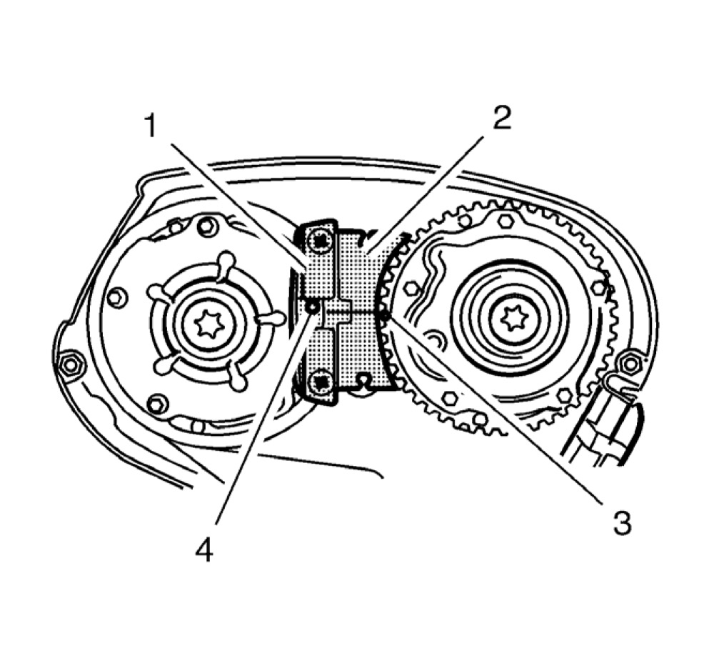 Note: The spot type marking (4) on the intake camshaft position actuator adjuster does not correspond to the groove of EN-6340 locking tool - left during this process but must be somewhat above as shown.