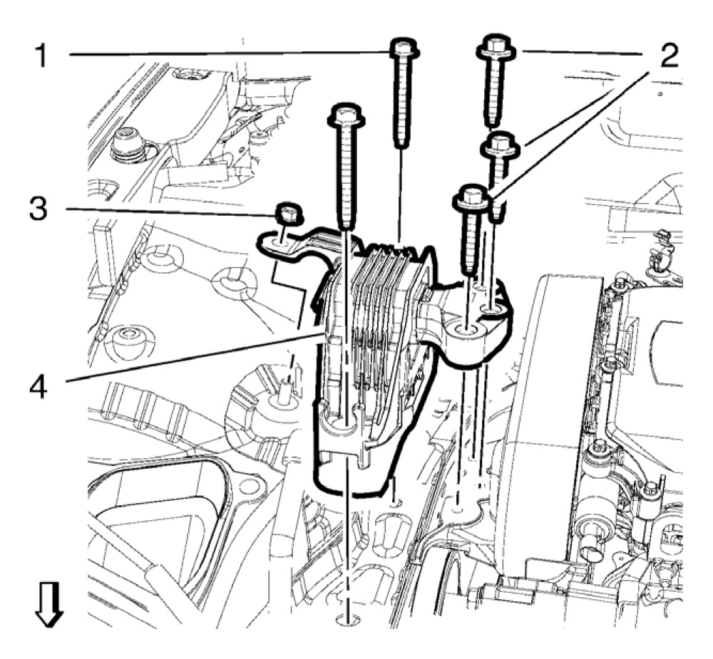 32. Install the 3 engine mount bracket bolts (1) tighten to 62 N.m (46 lb ft).