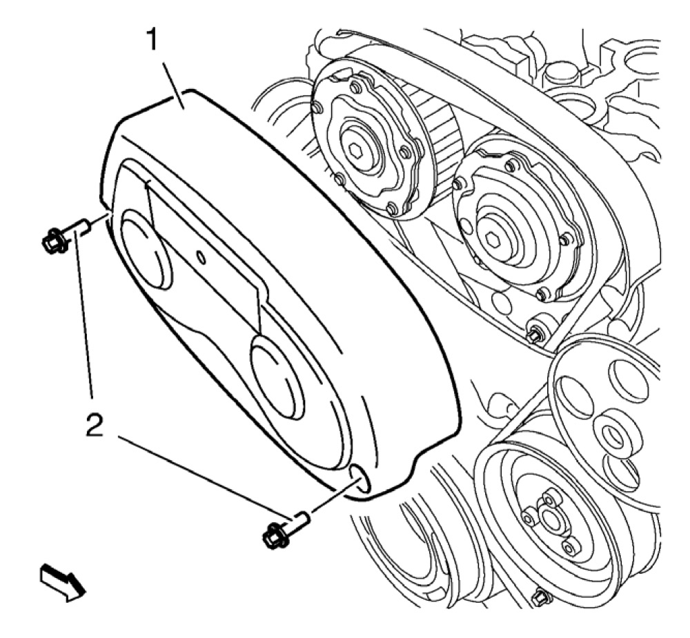 15. Remove the 2 timing belt upper front cover bolts (2).
