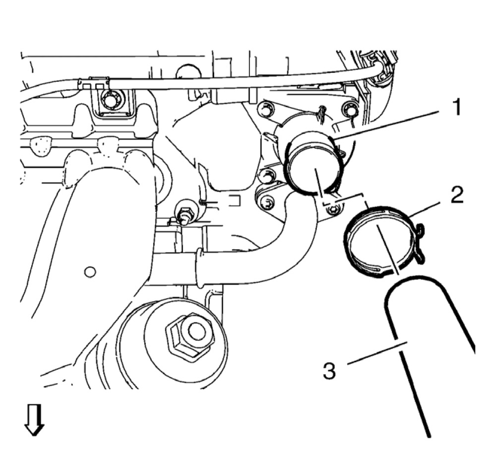 8. Remove the radiator inlet hose (3) from the engine coolant thermostat (1).
