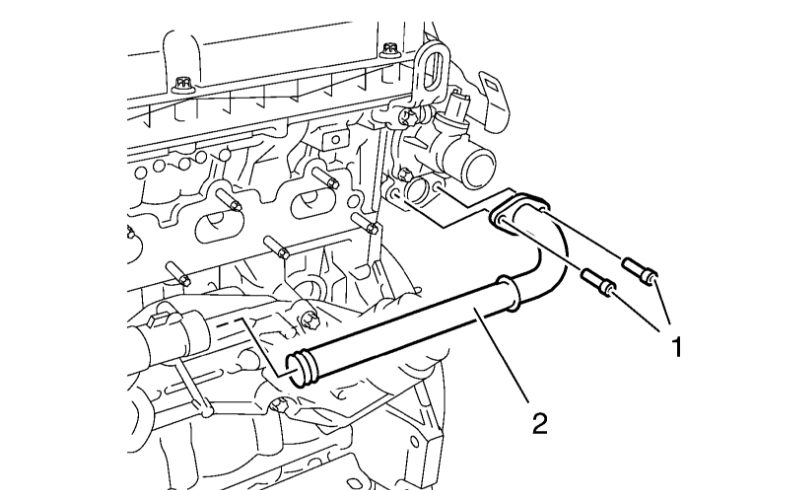 4. Remove the engine oil cooler outlet pipe (2) from the engine oil cooler housing and the engine coolant thermostat housing.