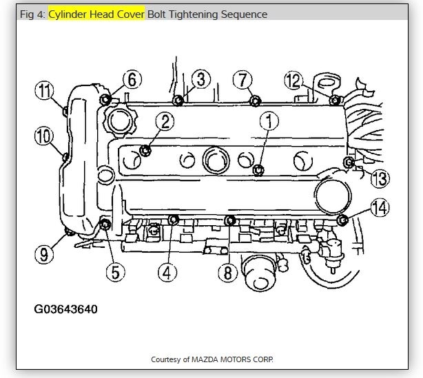 If the oil is leaking from the top of the engine, it is most likely a bad valve cover gasket. Or it could just be loose bolts around the valve cover. There is no 2005 626, just a 2005 Mazda 6. The image below is the Valve Cover of a 2005 Mazda 6, four cylinder engine, with the bolts numbered in the order that they should be tightened.