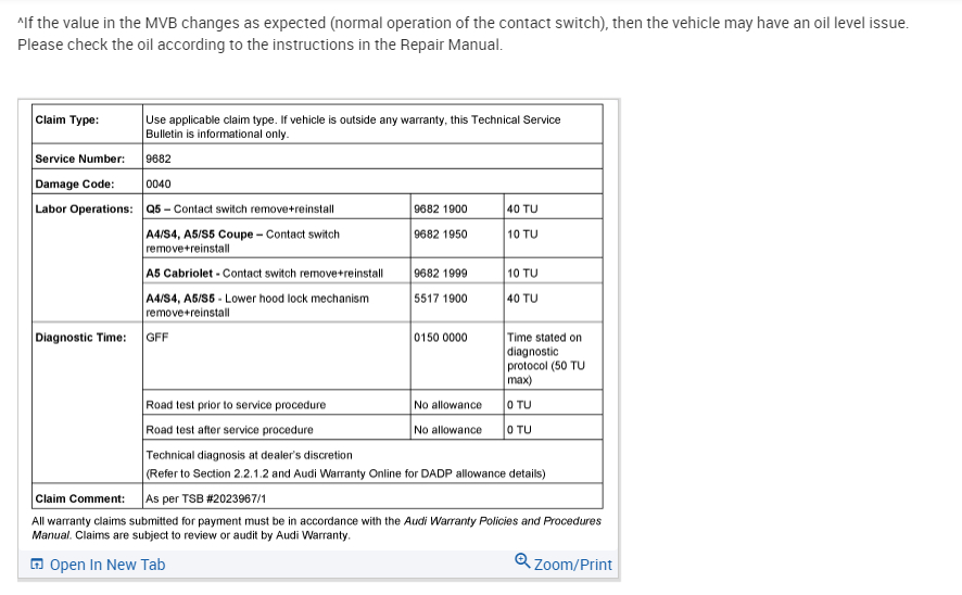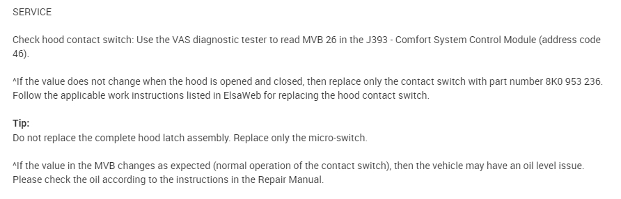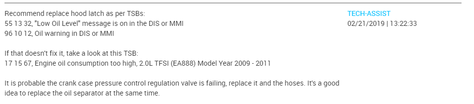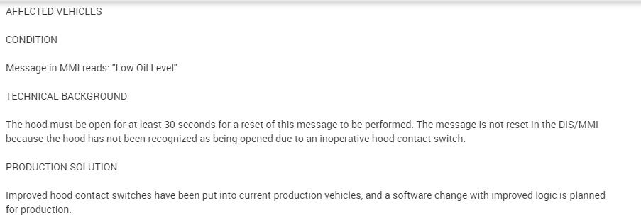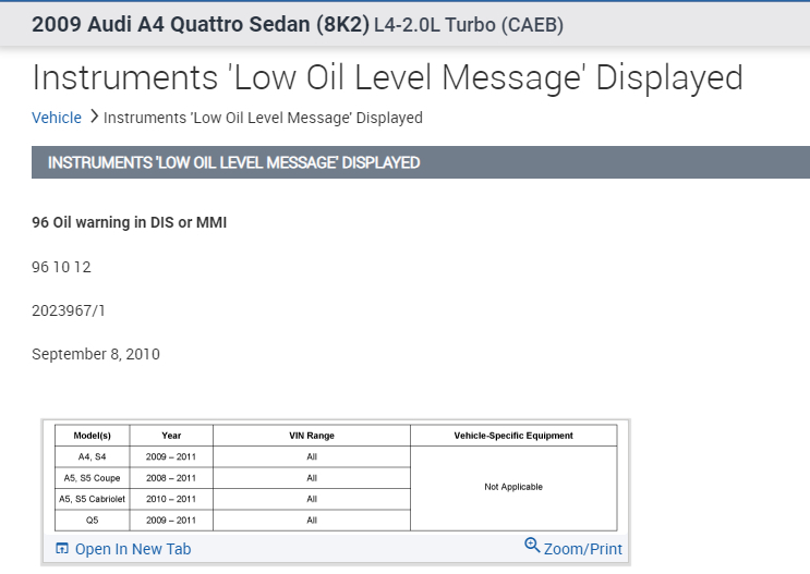 I had the oil changed. Before that there were no issues. I added the right amount of oil and I have a universal dipstick for Audis that I can check the right level. The MMI cluster shows full, brother drove it ten miles and it showed a message turn engine off, check oil level, but it showed that it was full, then check engine came on. No symptoms. If it was oil pressure message that would have been a big flag. No leaks, just strange. Is this something common out there or are there any TSBs?